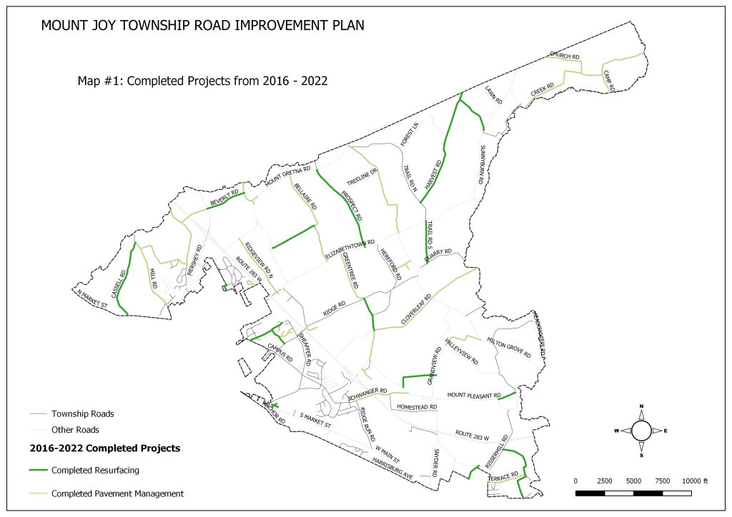 In 2018, the Township created a five-year improvement plan for the 2019-2023 period with the goal of regularly updating the plan for a five-year outlook. This enables us to keep a full work program for the coming years and leave flexibility in the later years as conditions change. We prepared an update for 2021-2025 in the summer of 2020 to progress the original work plan. An anticipated revenue drop in the early years of the planning period made its preparation a challenge, however, Mount Joy Township is proud to keep our road repair progress moving forward! Click to view or download the 2021-2025 Road Improvement Plan + Budget Spreadsheets.
